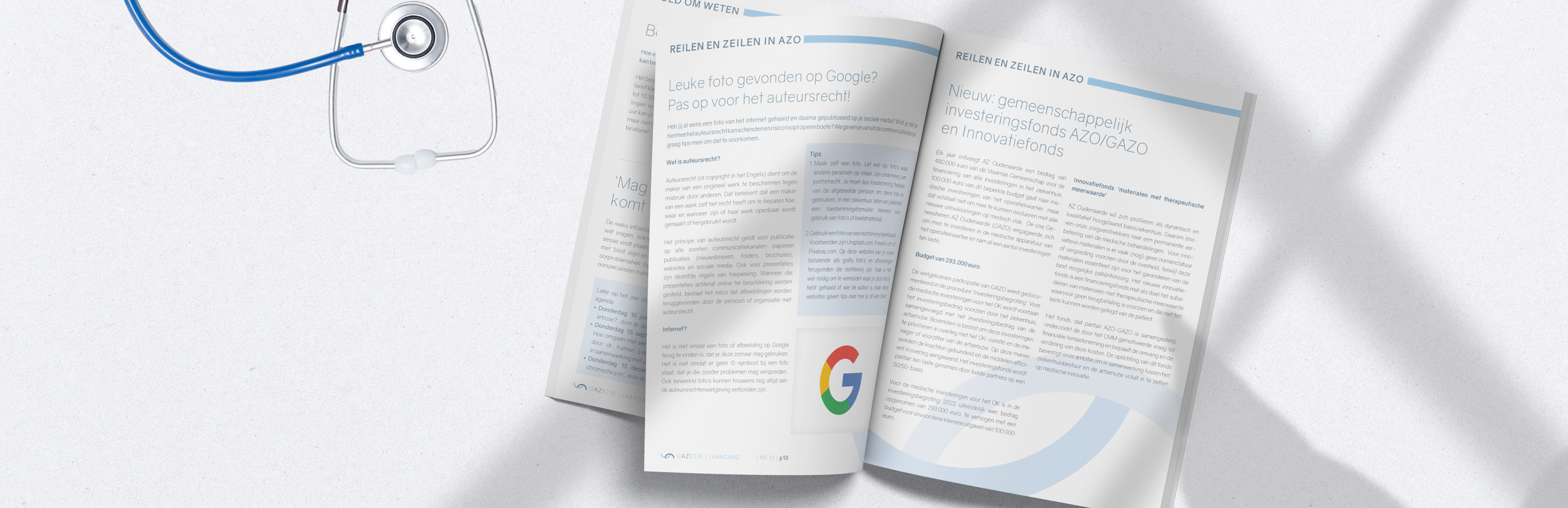 Voor AZ Oudenaarde verzorgen we op regelmatige basis het huisartsenmagazine en het interne gazetje. Dankzij een vaste contactpersoon binnen ons team verloopt de organisatie en communicatie vlot, en worden deadlines voor ontwerp en drukwerk altijd gehaald. Daarnaast creëerden we uiteenlopend marketingmateriaal, zoals kalenders, deurhangers, onthaalbrochures en consultatiekaarten.