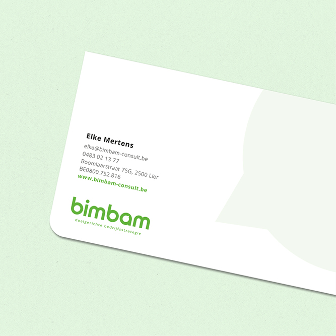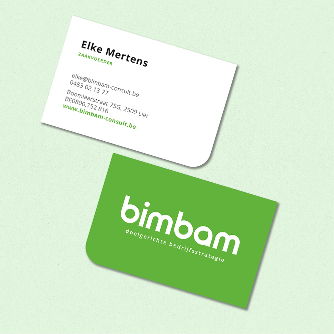 Elke vertrouwde op Grafica voor de branding van haar nieuwe onderneming, BimBam. We startten met een logo dat perfect aansloot bij haar visie én doelgroep en werkten vervolgens visitekaartjes, briefpapier, een e-mailhandtekening en een gebruiksvriendelijke PowerPoint-template uit.
