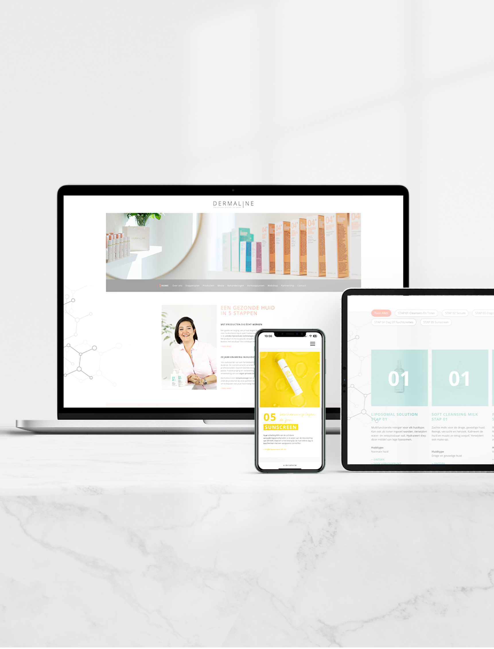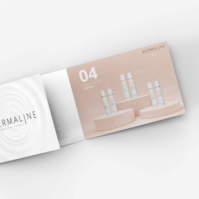 Na een jarenlange succesvolle samenwerking bij Jovilux vertrouwde zaakvoerder Caroline ook voor de lancering van haar eigen merk op Grafica. We ontwikkelden de naam, het logo en de volledige huisstijl, waardoor Dermaline een professionele en herkenbare uitstraling kreeg. Vervolgens werkten we de volledige verpakkingslijn, B2B- en B2C-folders en de website uit. En om alles mooi in beeld te brengen verzorgde onze fotograaf de product- en brandingfotografie.