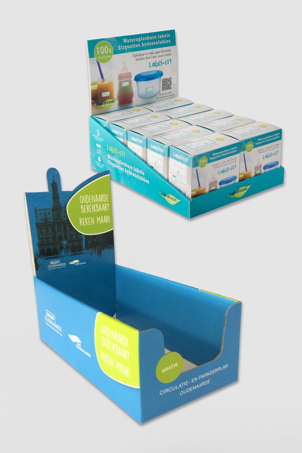 We werkten de vorm uit en realiseerden een blanco dummy model om afmetingen, stabiliteit en gebruiksgemak uitgebreid te testen. De losse headercard werd bovendien recto verso ontworpen zodat elke winkel eenvoudig de juiste taal kan kiezen. Dankzij de modulaire opbouw in stevig karton is de display licht, makkelijk te transporteren en snel te monteren.